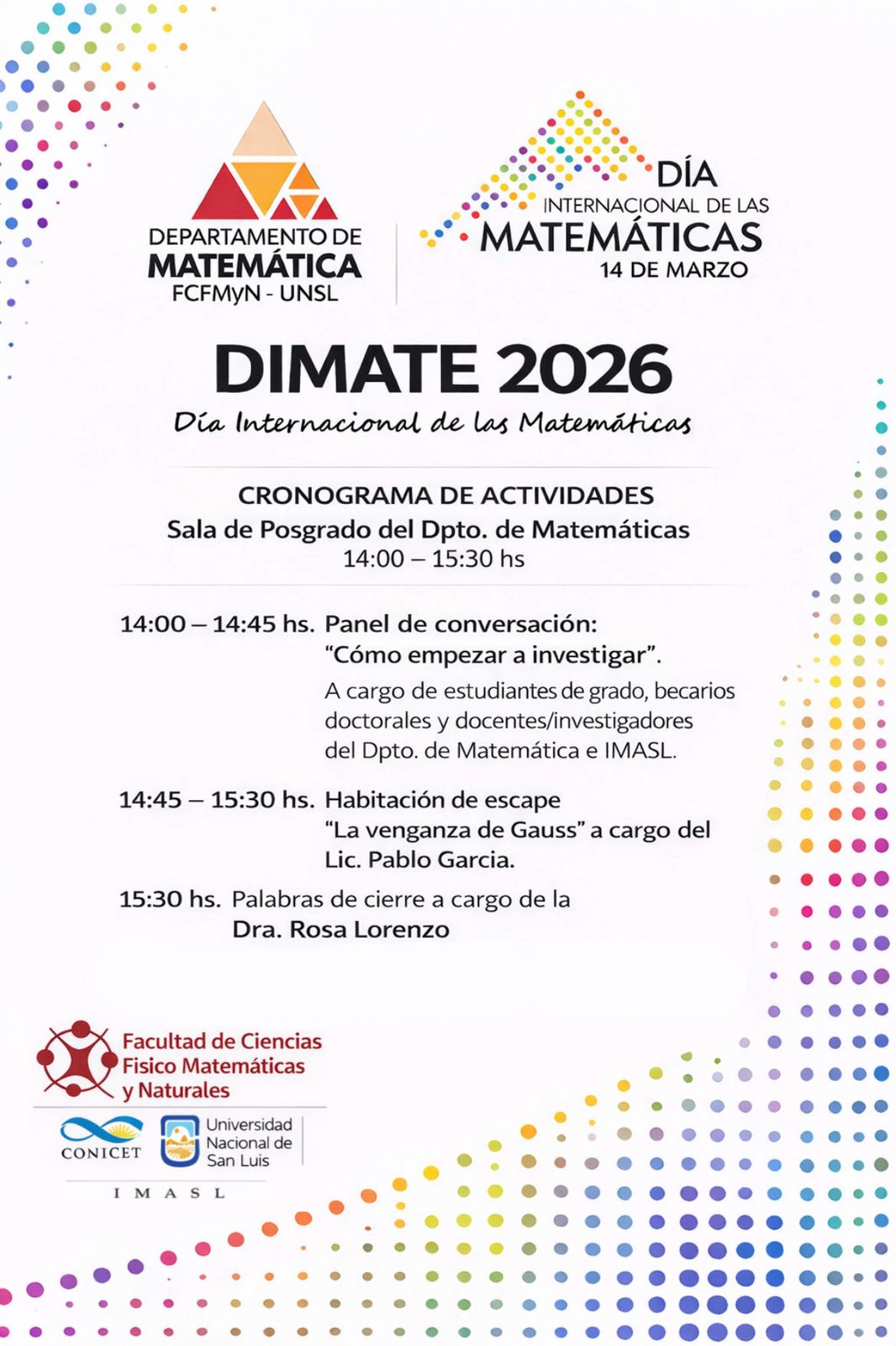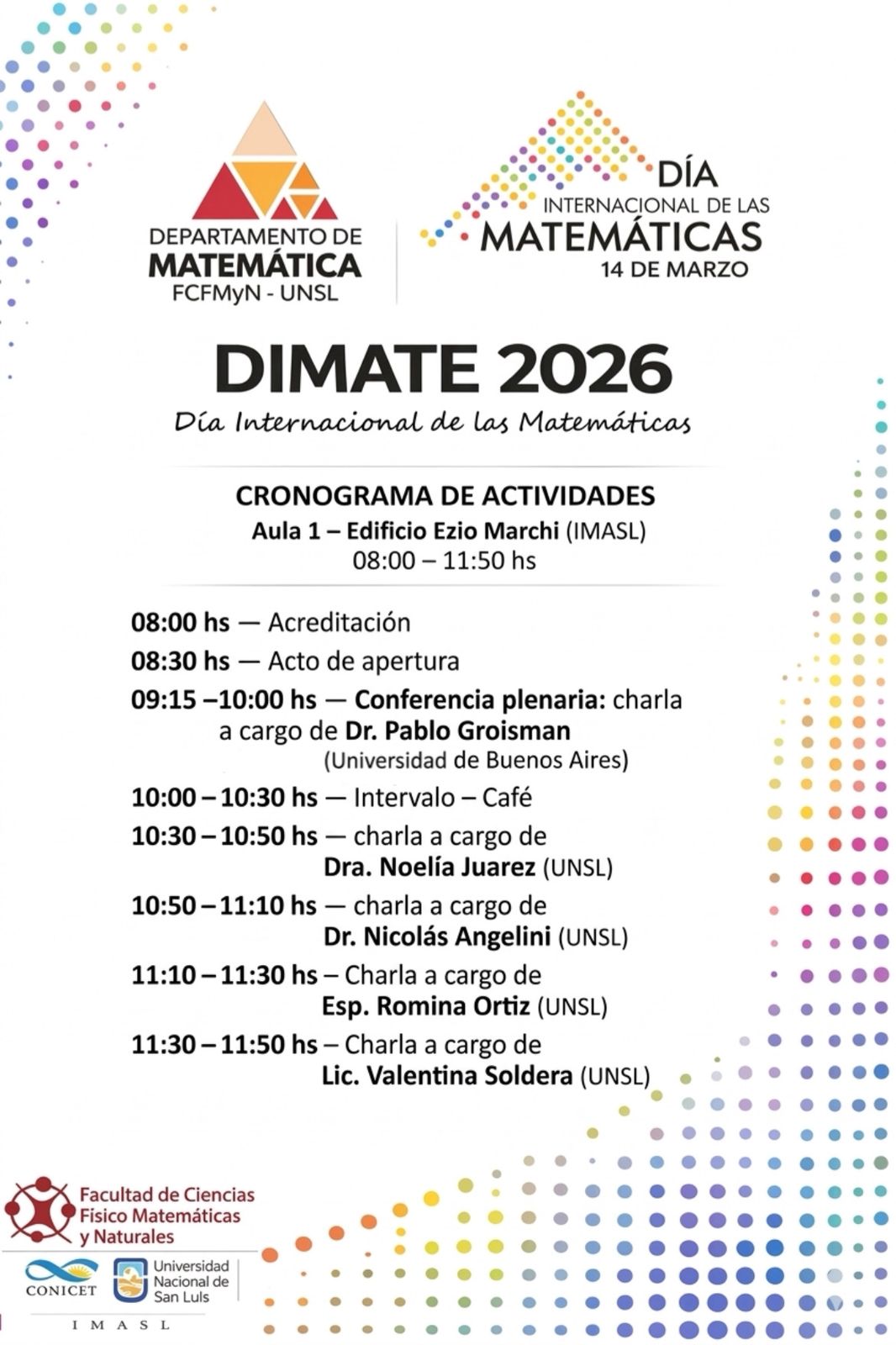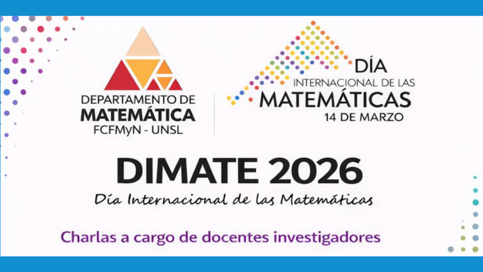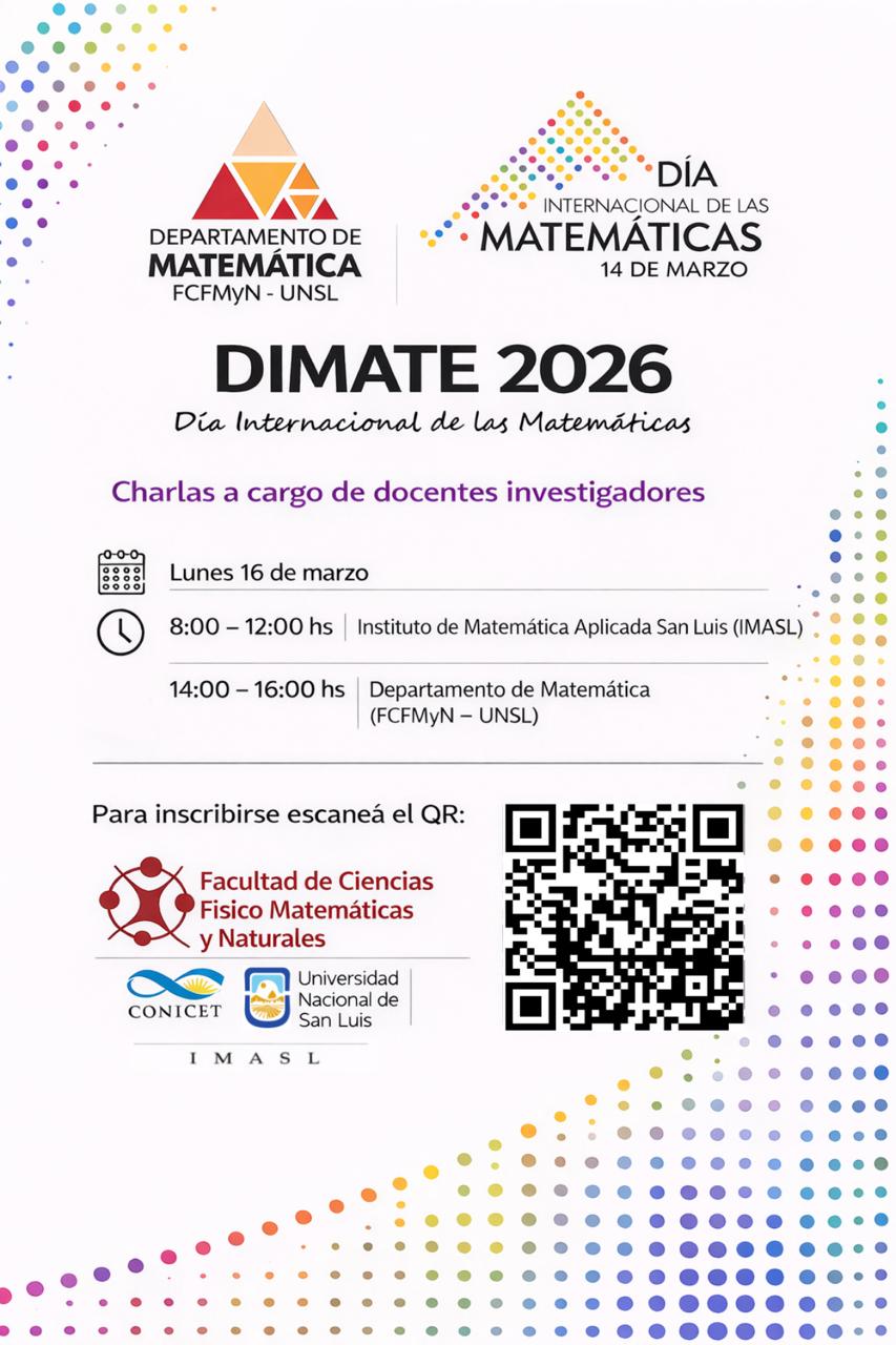 El Instituto de Matemática Aplicada San Luis (IMASL) y el Departamento de Matemática de la Facultad de Ciencias Físico Matemáticas y Naturales (FCFMyN-UNSL) invitan a celebrar el Día Internacional de las Matemáticas participando del DIMATE 2026. Será el lunes 16 de marzo de 08:00 a 12:00 hs. en el IMASL y de 14:00 a 16:00 hs. en el Departamento de Matemática de la UNSL. La actividad destinada a estudiantes de Licenciatura y Profesorado en Matemática. Contará con conferencias plenarias, charlas, paneles, entre otras actividades.